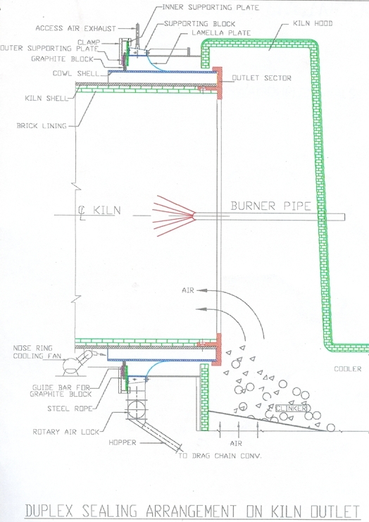 Normally the seals are available in ‘Inverted Leaves Spring Loaded Stainless Steel’ or ‘Graphite Blocks’. The Inverted Leaves Spring Loaded Stainless Steel Seals are having limitation because of lamination and from every joints the false air is entering into the Kiln and in the Graphite Block Seals, there is perfect sealing, but subject to the wear and tear caused by the clinker particles coming from the Kiln Hood occasionally because of pressurization.